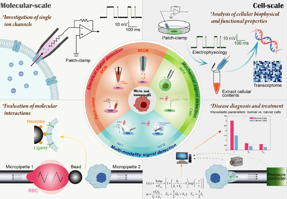 本文聚焦微纳移液管在单细胞信号检测领域的最新进展,系统介绍代表性技术的原理、工作模式及核心创新。同时,重点阐述了微纳移液管在分子与细胞尺度上的具体应用,包括单离子通道研究、分子相互作用探测、生物物理与功能特性分析以及疾病诊断与治疗等方向。这些应用正在重塑生物学研究格局,为解析复杂细胞过程提供了新视角。