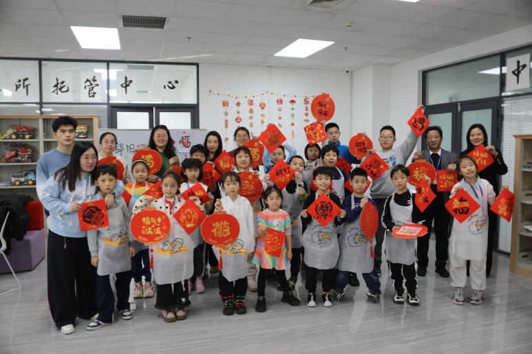 在实操环节,孩子们分组协作,蘸颜料、轻按压、慢揭纸,在红灯笼纸板上拓印出一个个金黑相映的福字,现场欢声笑语不断。完成作品后,孩子们互相展示成果,以一张张亲手拓印的福字送上新春祝福。