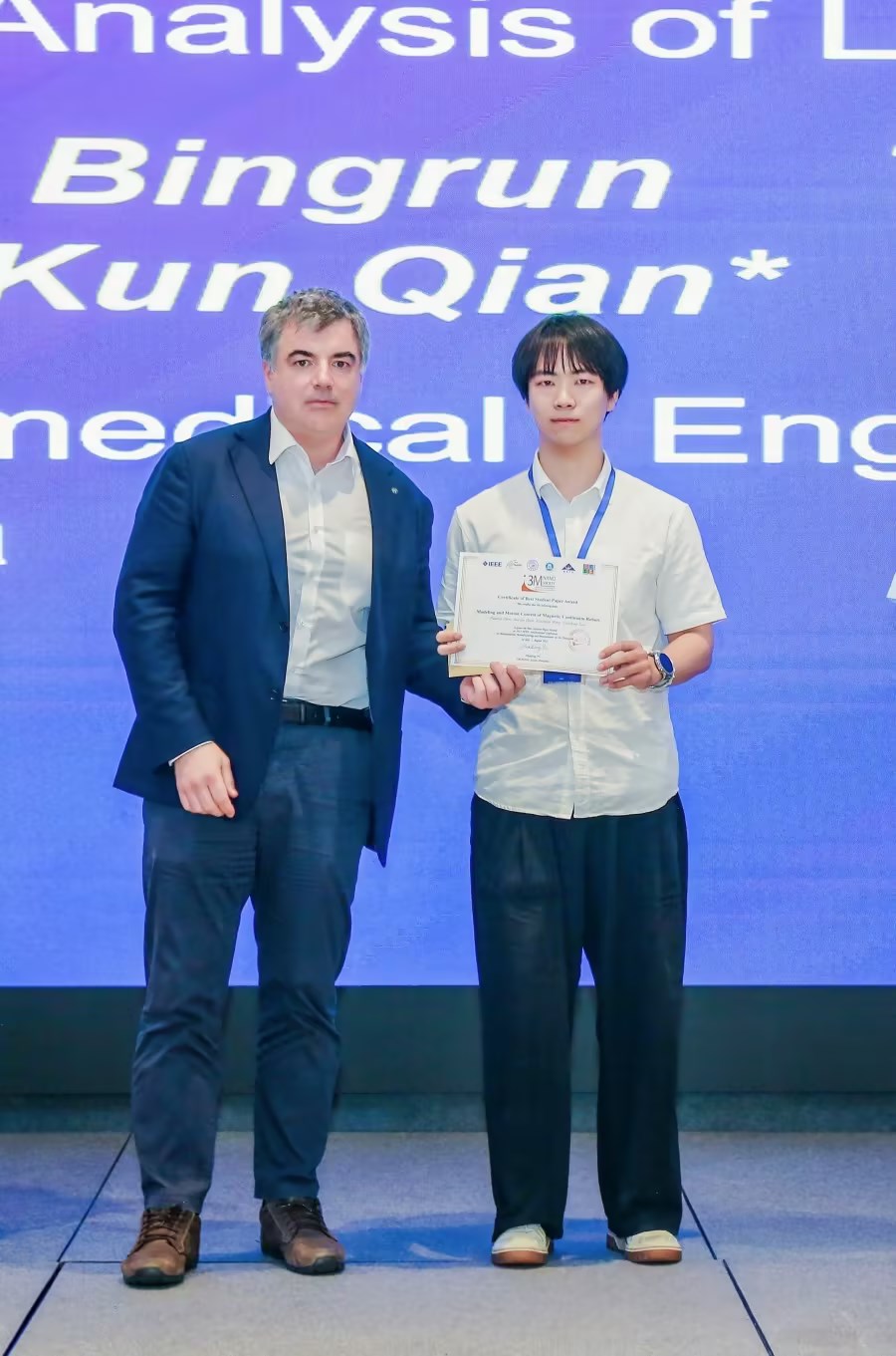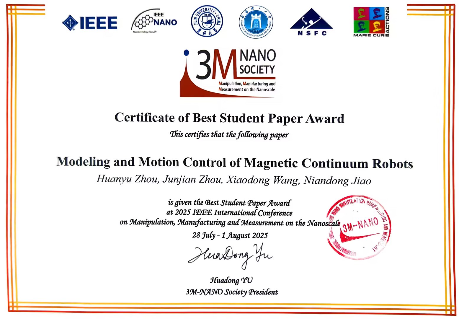 近日,中国科学院沈阳自动化研究所研究生参加了在吉林长春举行的2025年3M-NANO国际会议(IEEE International Conference on Manipulation,Manufacturing and Measurement on the Nanoscale, IEEE 3M-NANO 2025),博士研究生周桓禺论文获得大会最佳学生论文奖。诺贝尔物理学奖得主康斯坦丁·诺沃肖洛夫(Konstantin Novoselov)为课题组博士研究生周桓禺颁发3M-NANO最佳学生论文奖。