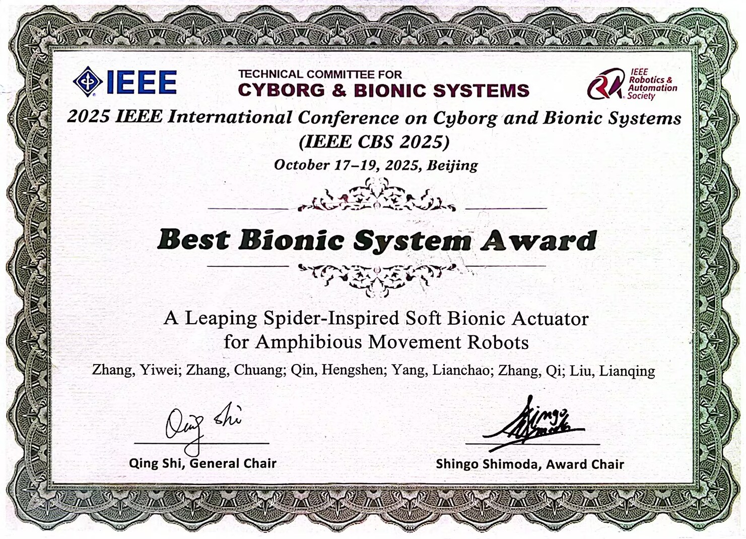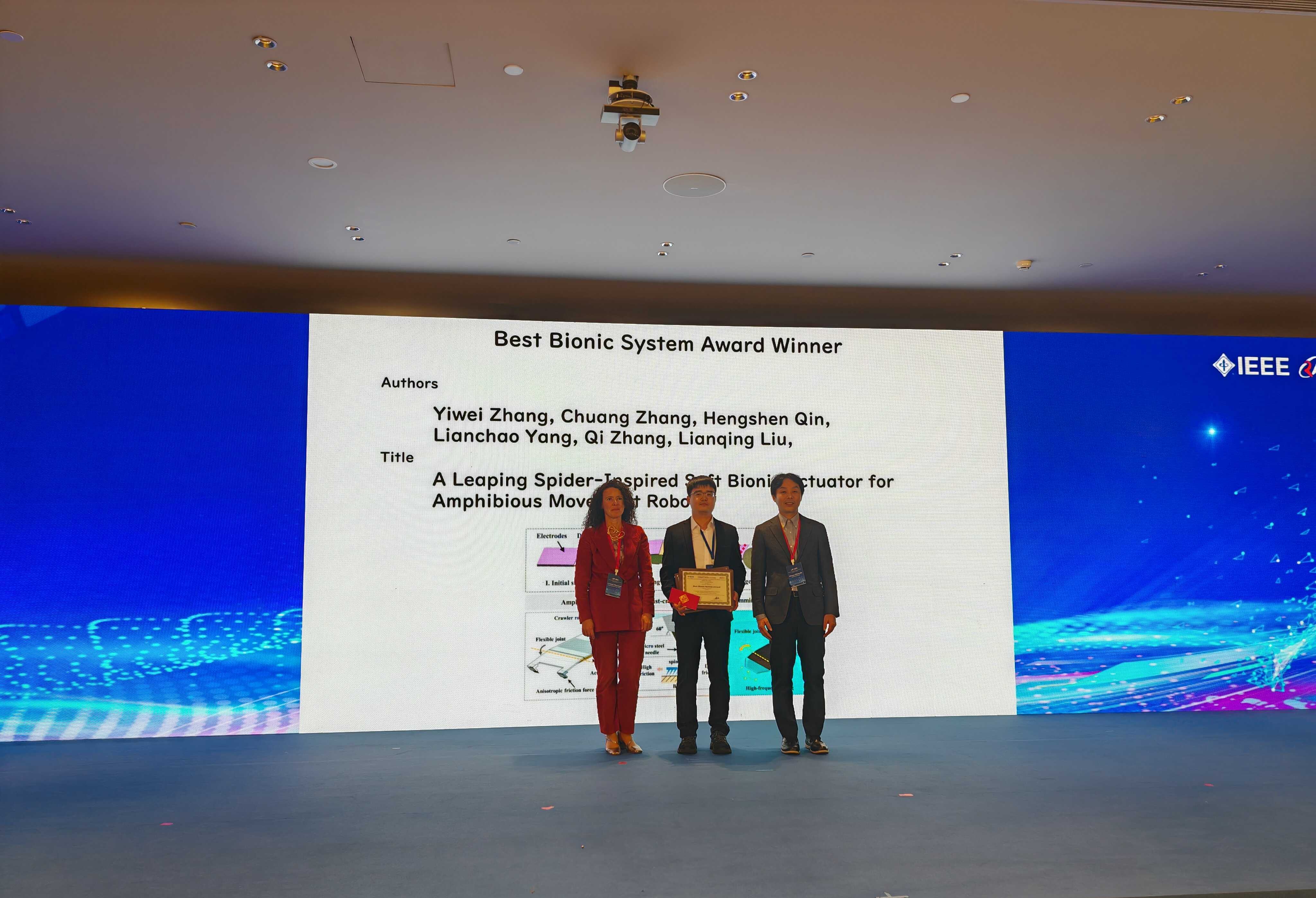 近日,2025年IEEE类生命与仿生系统国际会议(IEEE CBS 2025)在北京举行,中国科学院沈阳自动化研究所机器人学研究室微纳米课题组博士研究生张艺伟作等撰写的论文A Leaping Spider-Inspired Soft Bionic Actuator for Amphibious movement Robots获得了“最佳仿生系统奖”。