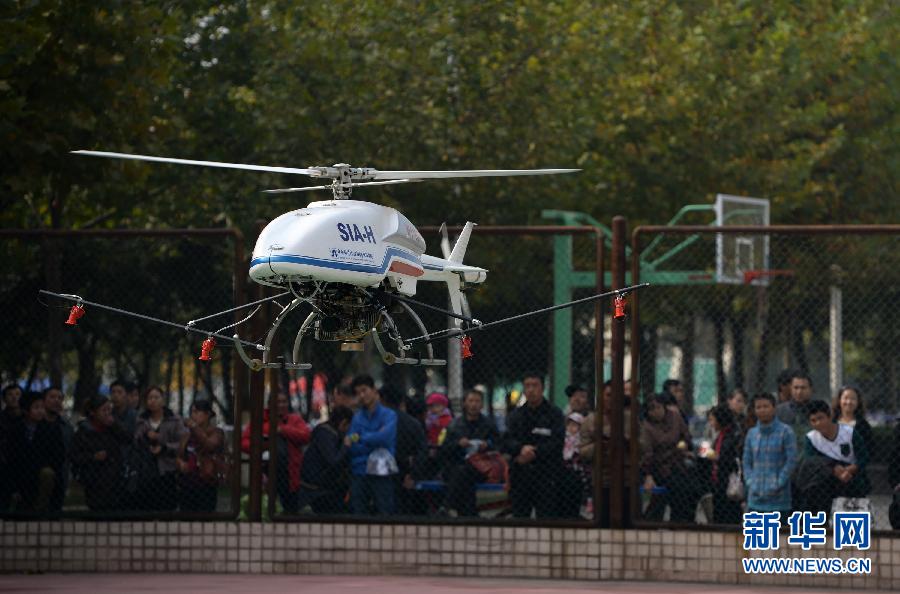 11月5日,中科院沈阳自动化研究所研制的农业无人机在农高会上进行飞行表演。 当日,为期5天的第20届中国杨凌农业高新科技成果博览会(简称“农高会”)在陕西杨凌拉开帷幕,中国科学院沈阳自动化研究所研制的高性能农业无人机进行了展示表演。农业无人机主要应用于精准农药喷洒作业,具有手动、半自动、全自动三种操作模式,最快施药速度100亩/小时,极大地节省了大面积农业生产中所需的人力。新华社记者李一博摄 |