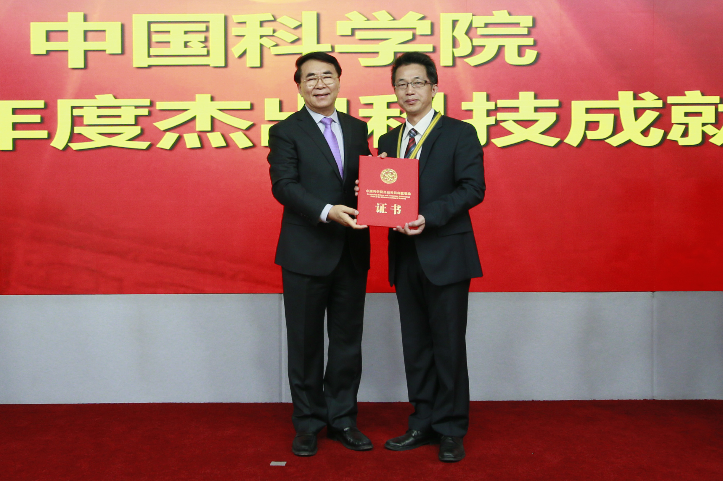 白春礼(左)为光电成像精确导引技术研究集体颁奖,史泽林代表领奖