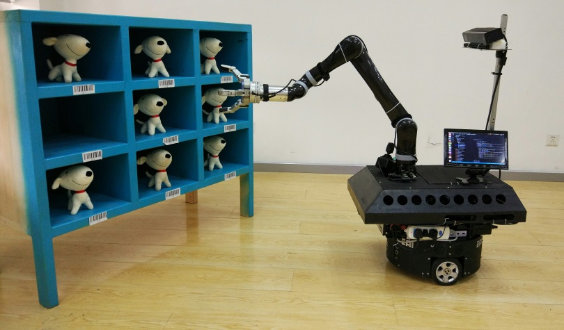 赛后合影 3月24至25日,在京东2017 JRC X机器人挑战赛总决赛中,由中国科学院沈阳自动化研究所贺凯、李建伟、王聪、刘玉、熊俊峰、胡茂邦组成的SIA FreeDream团队发挥出色,获得银奖。 在决赛中,12支团队可选择针对智慧物流的中心环节——无人仓内码垛和分拣两项作业其中的一项进行机器人演示。SIA FreeDream团队硬件上采用双轮移动平台为载体,搭载6自由度超轻型机械臂,4自由度多指灵巧手,Kinect RGBD相机和单线激光雷达,组成了具备工作空间内任意位姿可达,全局SLAM和全局视觉目标搜索的移动机器人平台,软件上基于ROS开源机器人操作系统,实现了RGBD相机环境三维PCL建模,激光雷达SLAM自主路径规划与导航,YOLO视觉深度学习与目标识别,Moveit OMPL与Jacobi运动学正反解组合分段路径规划,并且自研了支持ROS的8*8阵列Tactile触觉传感器,初步实现了易碎物品的柔性抓取。 基于以上软硬件平台,团队参与了移动分拣组的比赛。在比赛中,aging机器人平台表现出了较强的环境适应性,整个比赛中不需安装磁条、导轨以及任何物理标记;平台串联6自由度机械臂可灵活避障,进入狭小或复杂空间,末端灵巧手可实现对环境中多种目标、不同姿态目标的操作或柔性抓取。此外,该平台具备较大的自主性,可自主进行路径规划、导航,动态壁障;可对多种目标进行训练、识别,进而完成抓取作业。该系统也具备末端实时6维力反馈,可以更好保护机器人本体和操作对象及操作人员。机器人平台稳定、精准、流畅、全自主地一次性实现了所有目标抓取,获得评委好评。 京东X机器人挑战赛自2016年10月开赛以来,在全国七大城市、十所重点高校进行了巡讲,来自81所高校的185份作品经过初赛、复赛的激烈角逐,最终12支团队进入决赛。大赛共评出金奖一项,银奖一项,铜奖一项,专项奖若干。该赛事获得了京东官方微博,爱奇艺,乐视网,央广网,环球网,企鹅,百家号,搜狐公众,UC等众多媒体的报道,具有广泛的社会影响力。(机器人学研究室 贺凯) |
