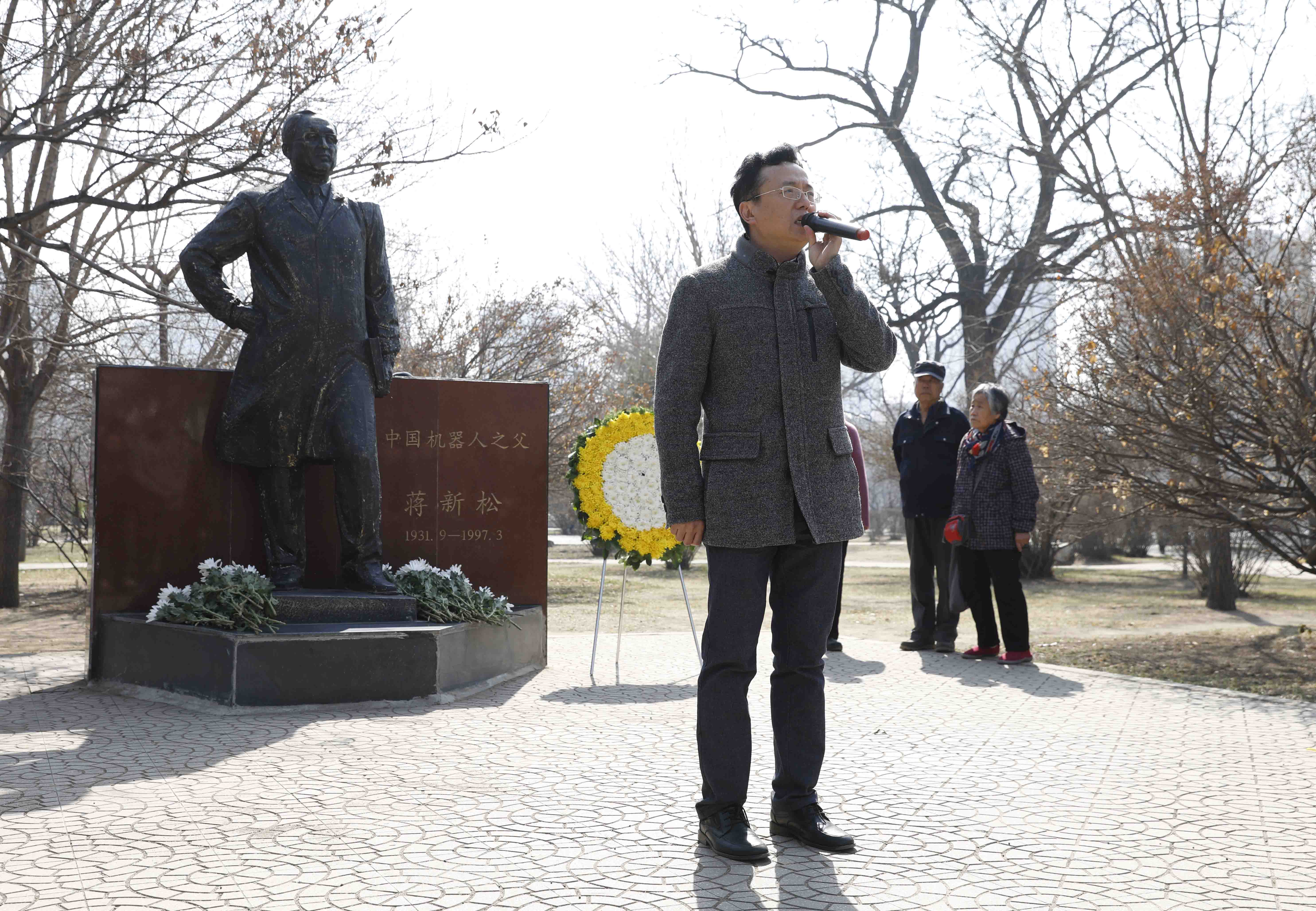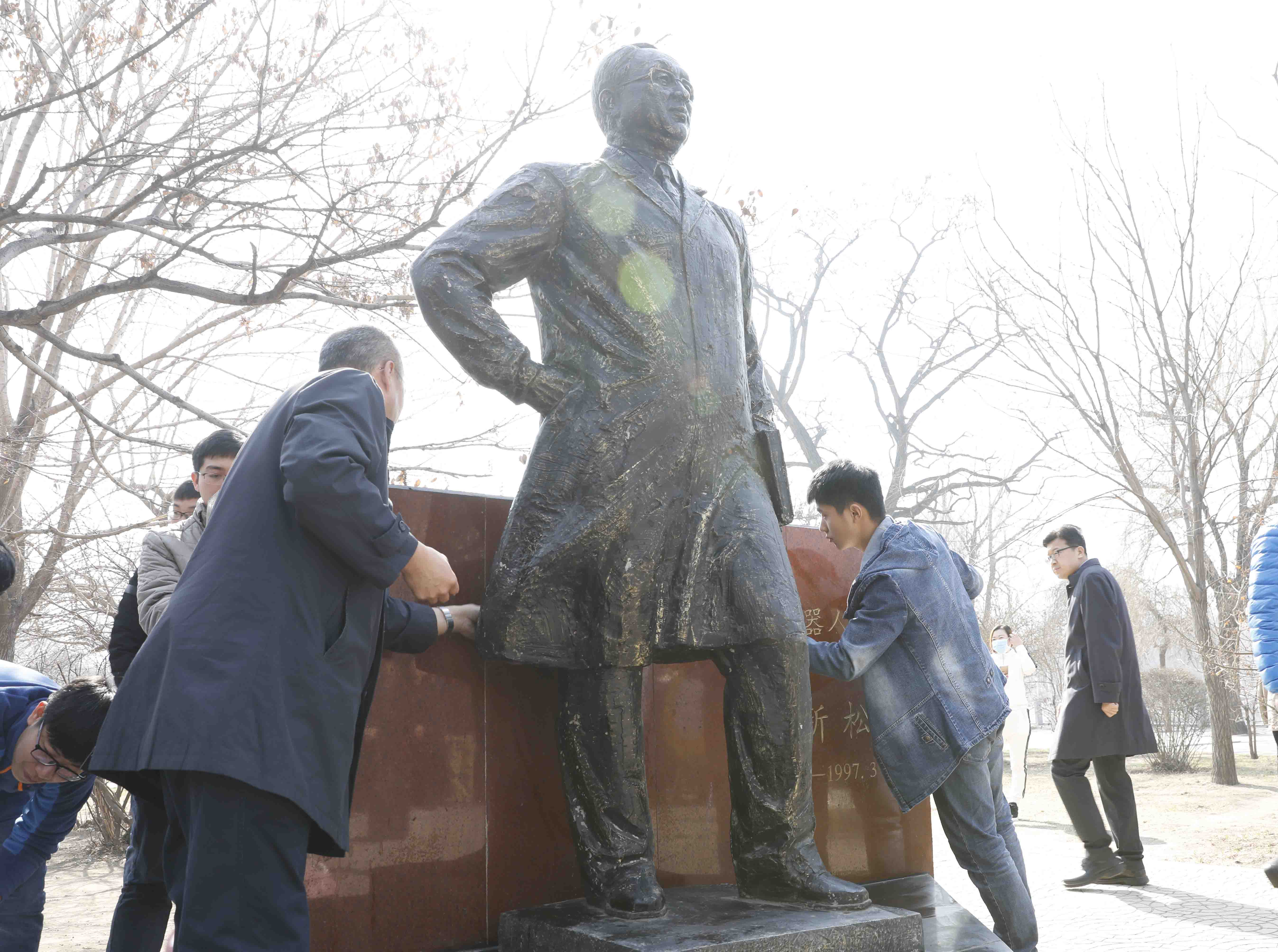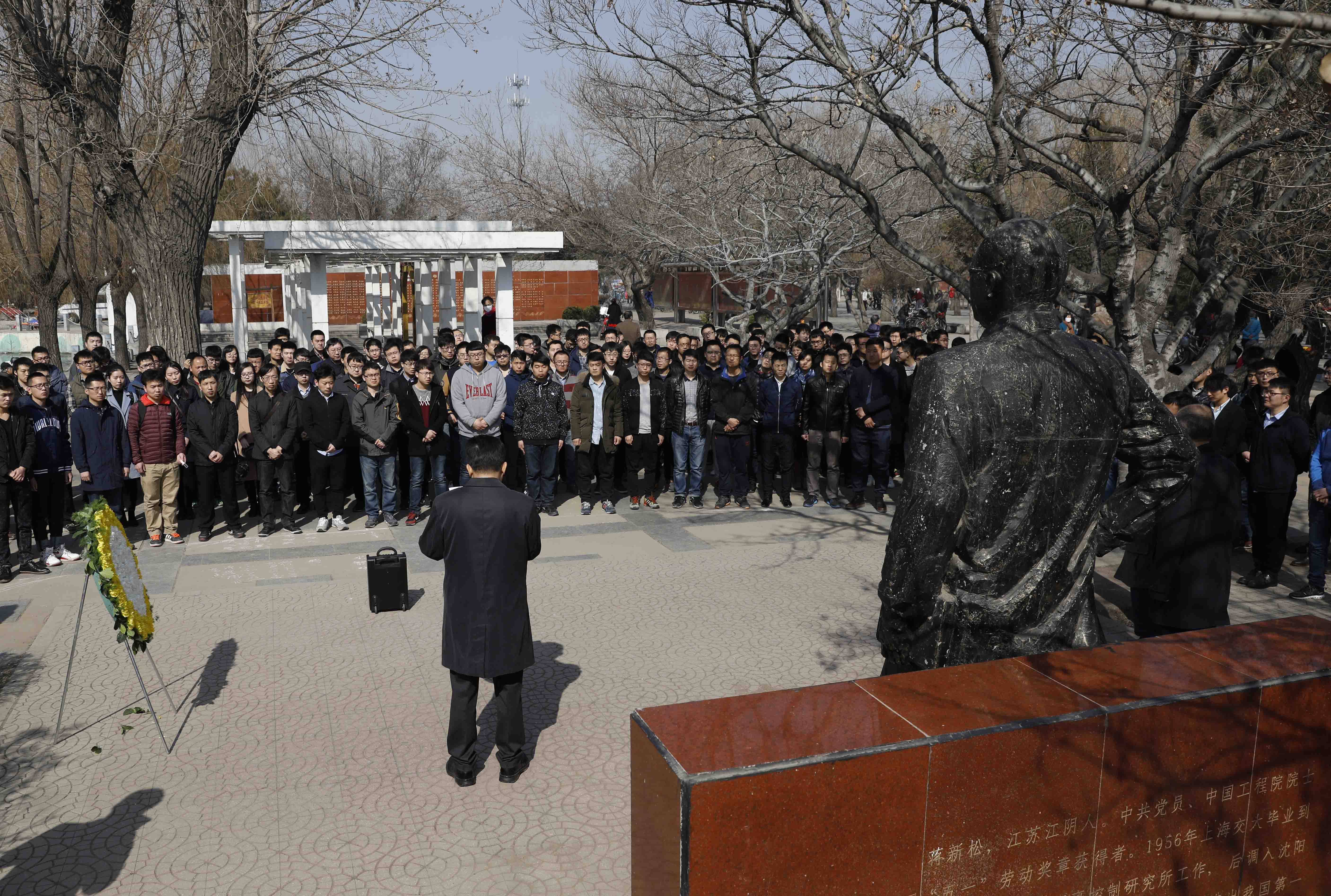 4月1日上午,沈阳市劳动公园,近200名中国科学院沈阳自动化研究所职工和研究生整齐有序地站在蒋新松院士塑像前,手持鲜花、神情庄重。几名职工代表正认真地擦拭着塑像。
