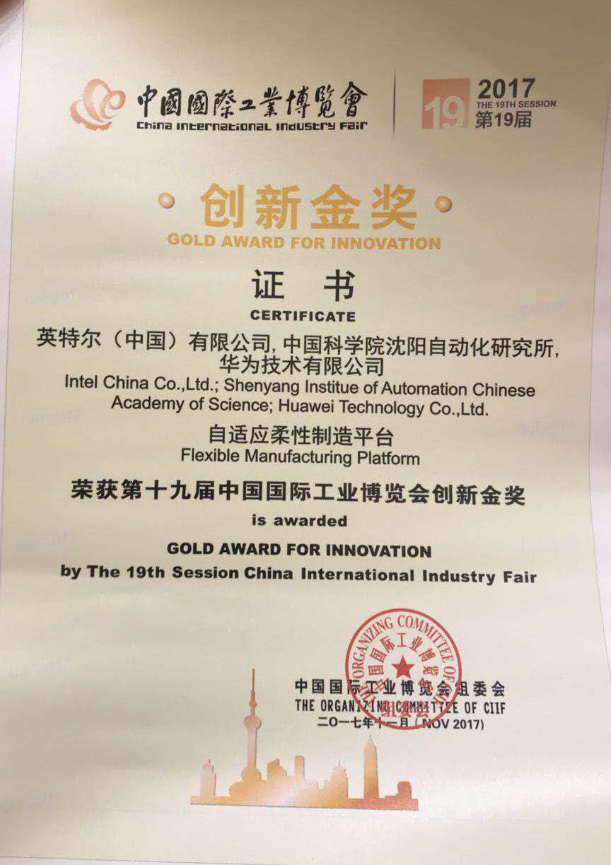 第十九届中国国际工业博览会于11月7日至11日在上海国家会展中心举办。由中国科学院沈阳自动化研究所与英特尔(中国)有限公司、华为技术有限公司联合研制的“自适应柔性制造平台”获得第十九届中国国际工业博览会创新金奖,是四项创新金奖之一。