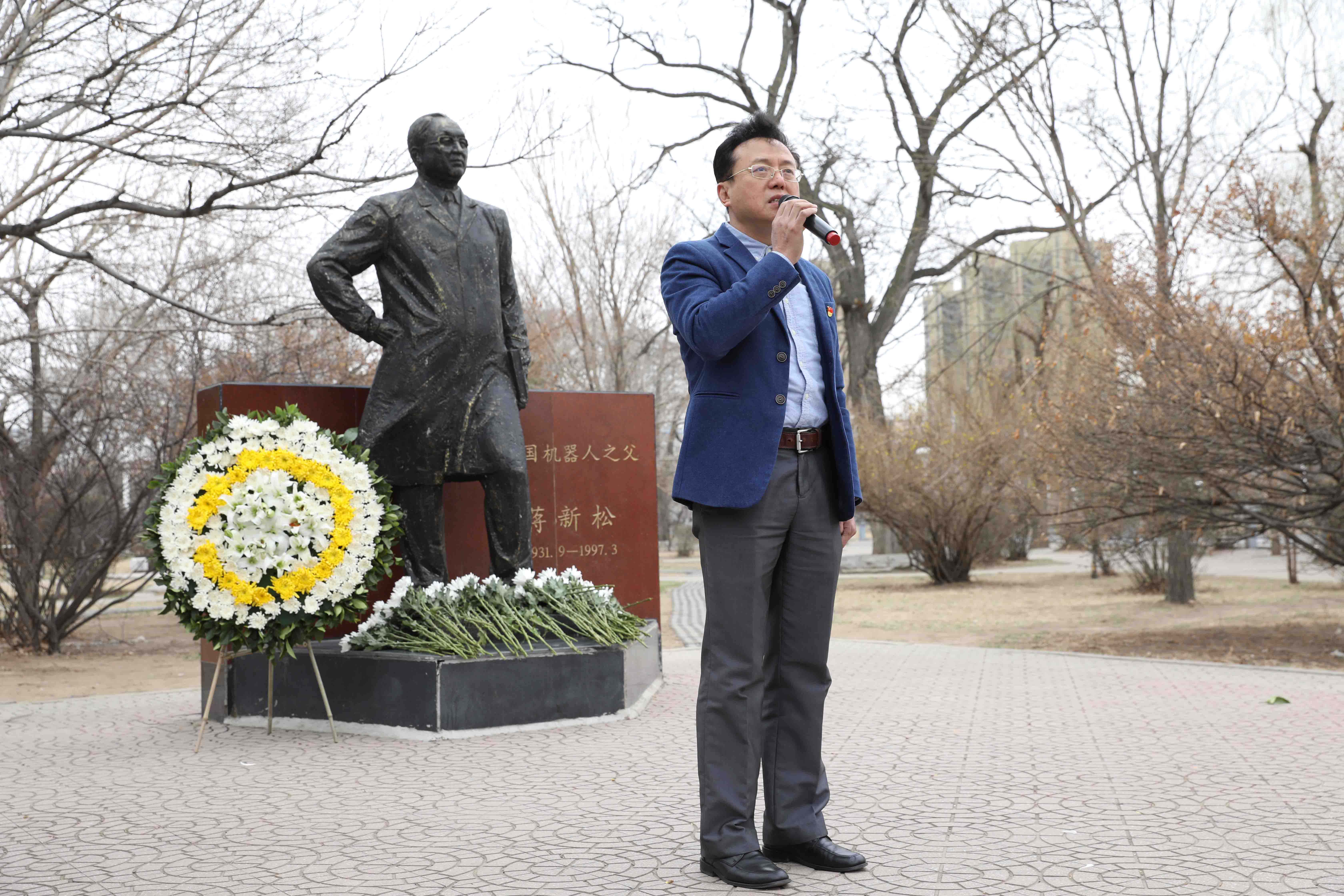 随后,桑子刚和孙雷为蒋新松塑像献上花篮。参加活动人员依次为塑像献上鲜花并默哀。