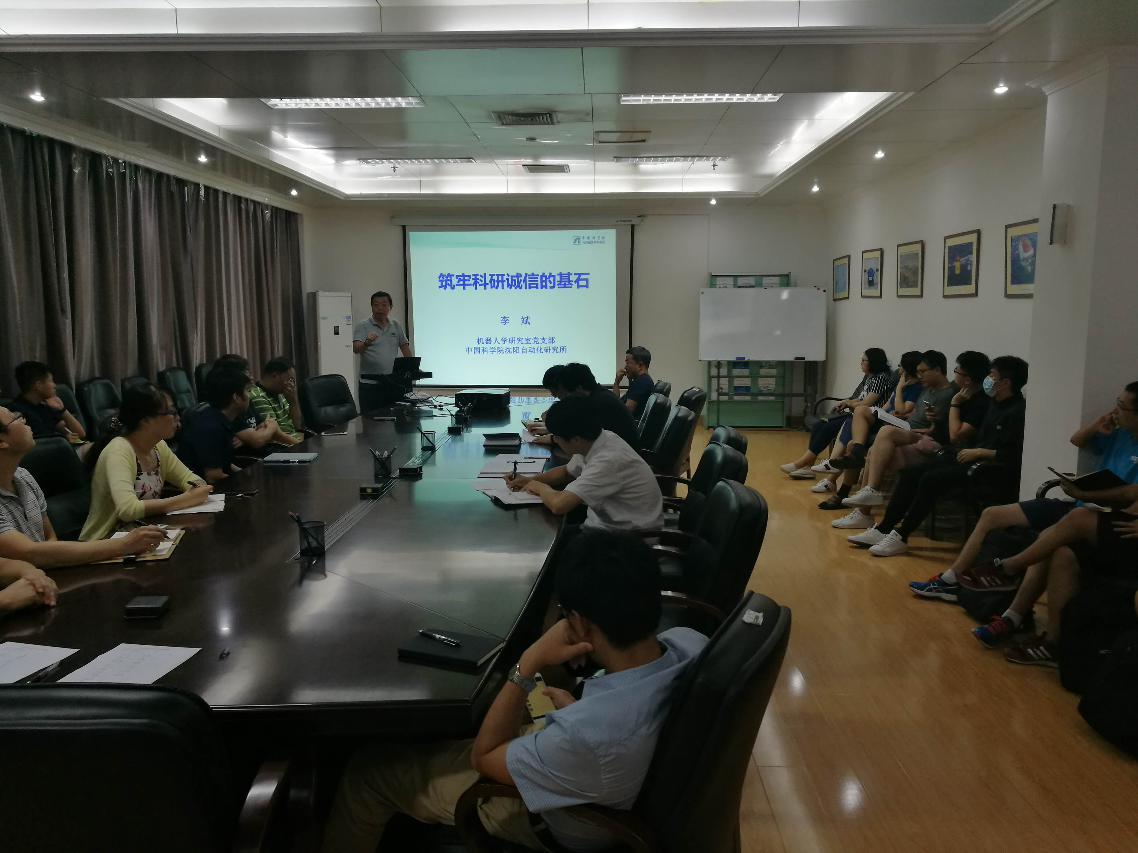 8月17日,中国科学院沈阳自动化研究所机器人学研究室党支部组织全体党员开展了“筑牢科研诚信的基石”专题学习活动。党支部书记李斌为与会党员作了题为《筑牢科研诚信的基石》的党课报告。