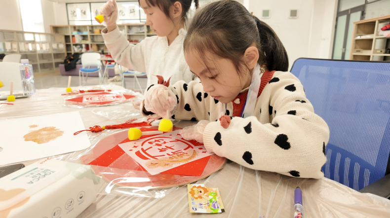在实操环节,孩子们分组协作,蘸颜料、轻按压、慢揭纸,在红灯笼纸板上拓印出一个个金黑相映的福字,现场欢声笑语不断。完成作品后,孩子们互相展示成果,以一张张亲手拓印的福字送上新春祝福。