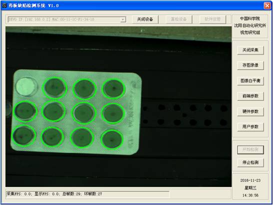 缺陷检测类型:缺粒、残粒、批号缺失、泡罩板边缘不规则、胶囊漏粉、药品异物、杂质等. 检测速度:每秒6板,准确率:》97%